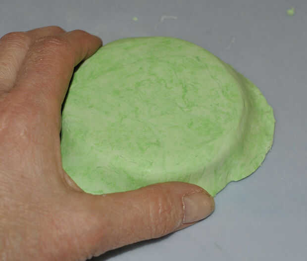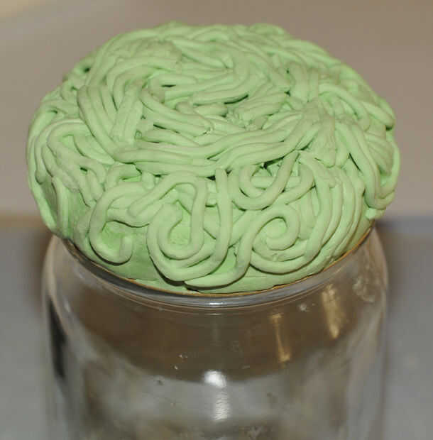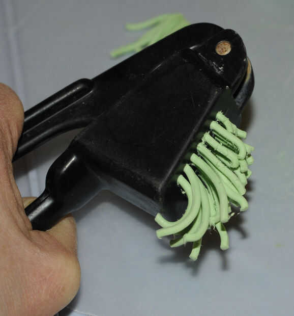 Corte alrededor de la tapa con una herramienta de la aguja dejando a un poco más de un ½" margen dependiendo del ancho de su tapa. Alisar el círculo de barro sobre la tapadera. Si se usa una tapa de tarro de masón, unir las dos piezas. Humedece su dedo y alise cualquier grieta. Usando la prensa de ajo, presione la pieza de arcilla verde que reservan en mechones de arcilla. Humedecer ligeramente las hebras y comenzar a colocar a estos en la parte superior de la tapa. Esto va a ser nido del conejo. Dejar esto de lado
