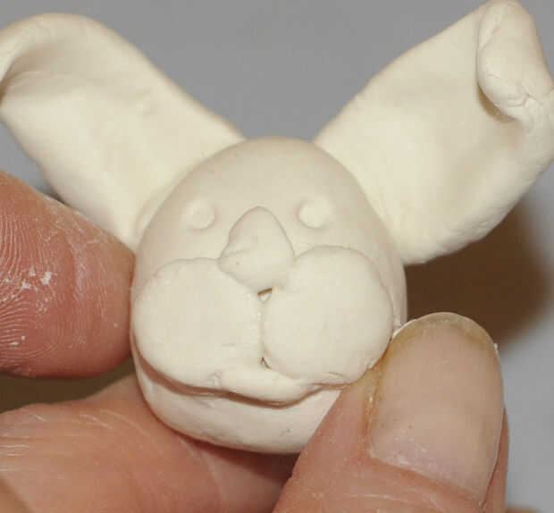 Pellizcar un pequeño triángulo para la nariz, una pequeña bobina para el labio y dos formas de larga lágrima para los oídos.