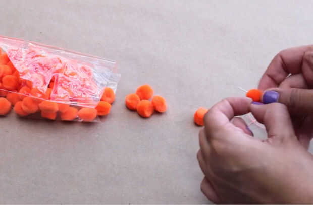 Entonces, pase los pompones en la cadena hasta que tengas suficiente para encajar la madera ronda.