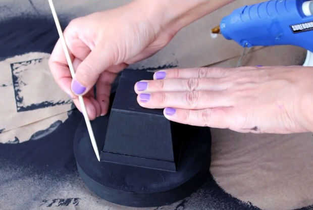 Ahora, con la madera seca, crear el pedestal del tarro de dulces. Conecte la pistola encoladora y luego trazar la boca de la base en el centro de la madera redonda.
