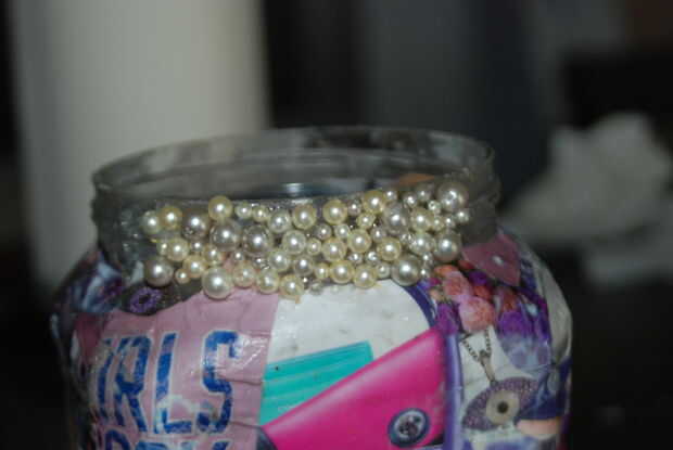 Ahora puedes poner pegamento caliente en una porción de la llanta en la jarra y todos los granos de diferente tamaño de la gota sobre él. Para ello toda la manera alrededor para ocultar la mirada como una jarra normal. También para que se vea mucho más bonito.