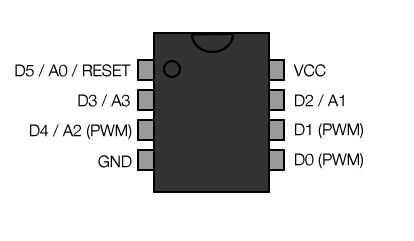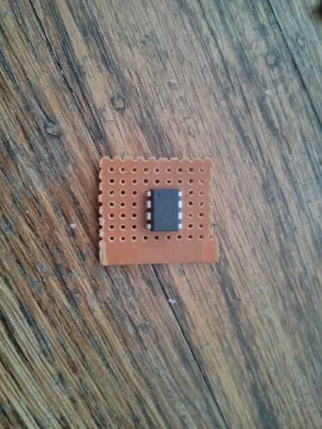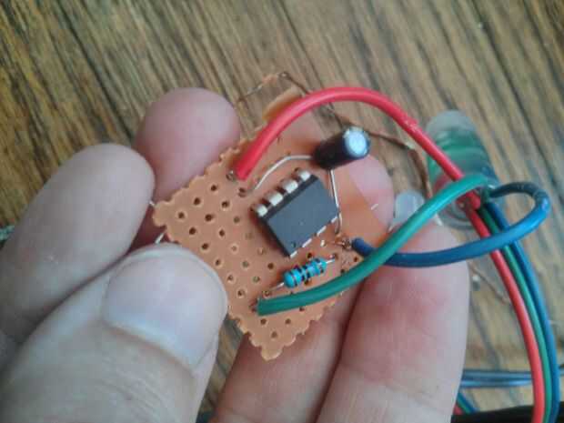 Suelde el ATTiny a un pedazo de perfboard. Incluir un capacitor de desacople en la fuente de alimentación y una resistencia de pequeño valor. Si desea que la instalación sea más flexible instalar un zócalo DIP de 8 pines para que puedas quitar y reprogramar el microcontrolador más adelante.