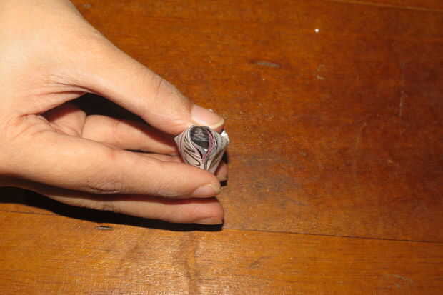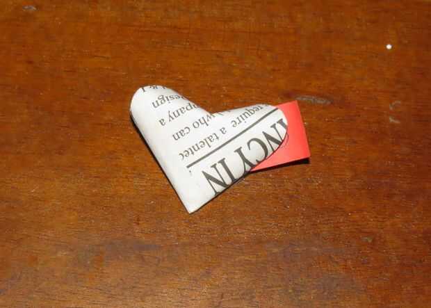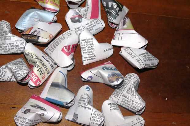rollo de la razón a mitad de camino y el inserto en el corazón, en caso de que el agujero no es suficiente para entrar en los rodillos, con las tijeras hacer el agujero más grande, introducir los rollos en corazones dejando un trozo de papel hacia fuera.