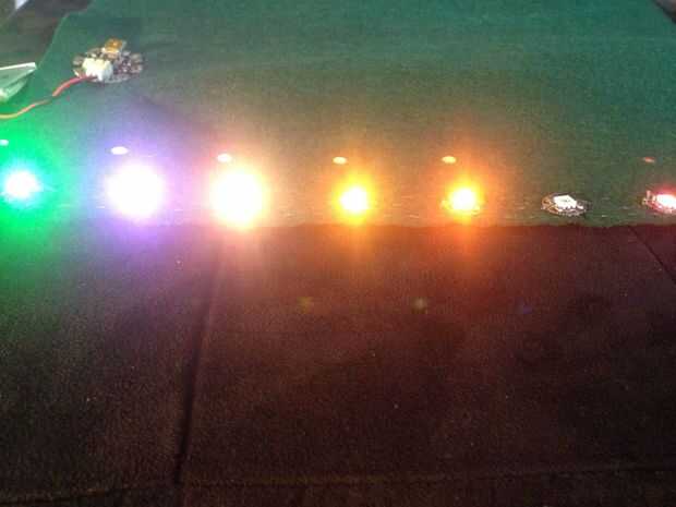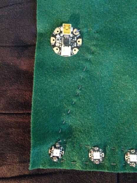 Coloque la gemma en el fieltro usando hilo no conductor y luego coser las líneas correspondientes a los píxeles del neo. Coloque el nodo negativo en el lado negativo (-) del circuito paralelo. Asegúrese de mantener las puntadas pequeñas y apretadas para que no debilite y también son más conductores más puntadas. Conecte el nodo D1 a los nodos de la flecha en el pixel neo (->). Por último, conecte el nodo Vout al lado positivo de los píxeles de neo (+). Ser conscientes de los cables deshilachados y colgando de cuerdas de nudos. También asegúrese de alinear el diagrama antes de mano para que compromiso no se ven obligado a cruzar entre sí en la costura.