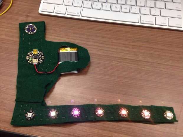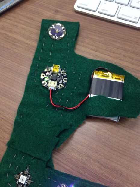 Una vez que tienes todo asegurado te puede reducir la cantidad de fieltro utilizado y recortarlo. Incluso hice un bolsillo pequeño de la batería. Asegúrese de que utilizar cuerdas no conductoras no cortocircuitar cualquier circuitos.