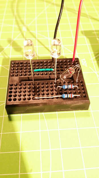 2. poner las dos resistencias entre el interruptor de la inclinación y la (largo plomo) el ánodo de cada LED.