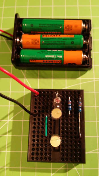 Ahora ponga las pilas en el soporte de una prueba de su circuito. Para encender los LEDs, voltee la placa.