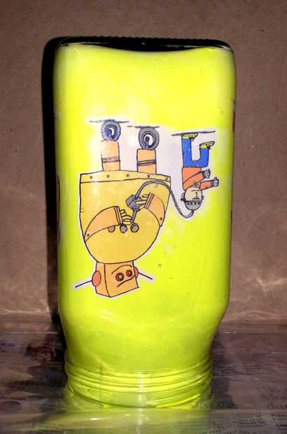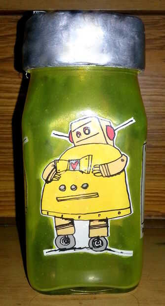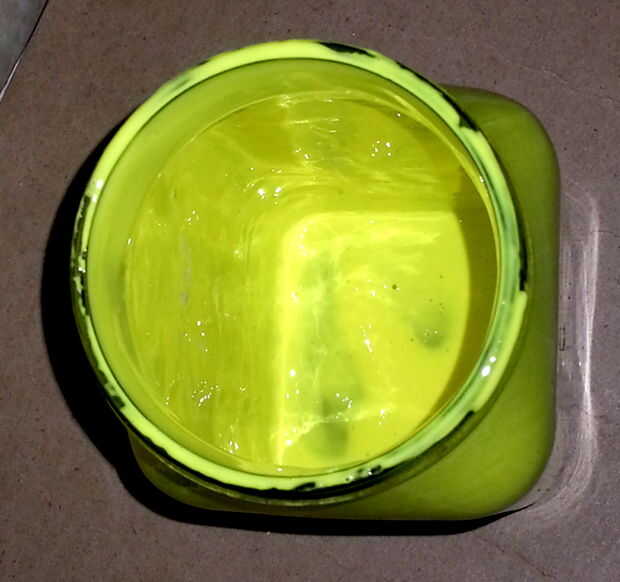 Agitar el frasco bien, o simplemente extender el pegamento coloreado con la ayuda de un cepillo (de nuevo, importa las burbujas!). Deja el tarro invertido durante algún tiempo a dejar que el pegamento sobrante caiga.