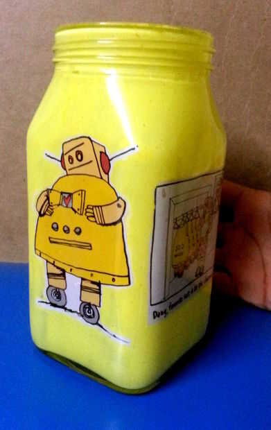 Aplicar el PVA pegamento en la parte frontal de los cuadros y pegarlos en el interior de la jarra. Espere a que el pegamento se seque.