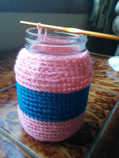 Una vez que ha hecho a ganchillo todo el camino hasta el cuello de la jarra y han probado para asegurarse de que es un buen ajuste. Acabado su trabajo usando un nudo bien fuerte.