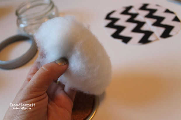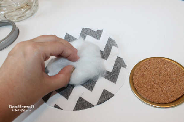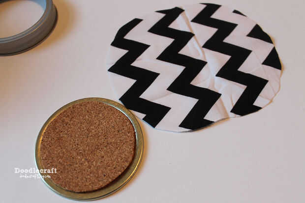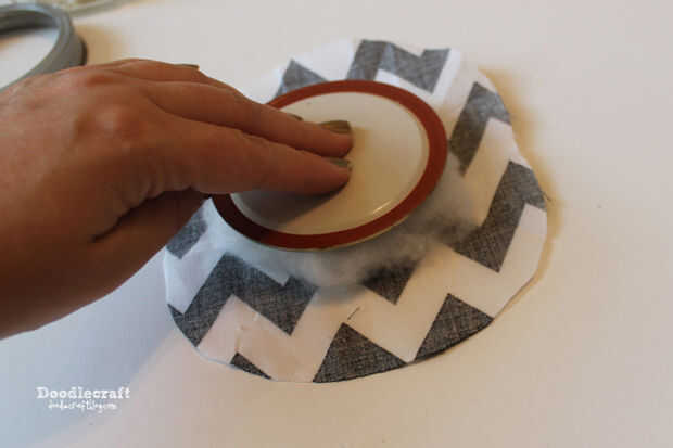 A continuación, corte un círculo de tela... de 7 pulgadas o así... sobre una pulgada o 1 1/2 pulgadas más grande que la tapa.