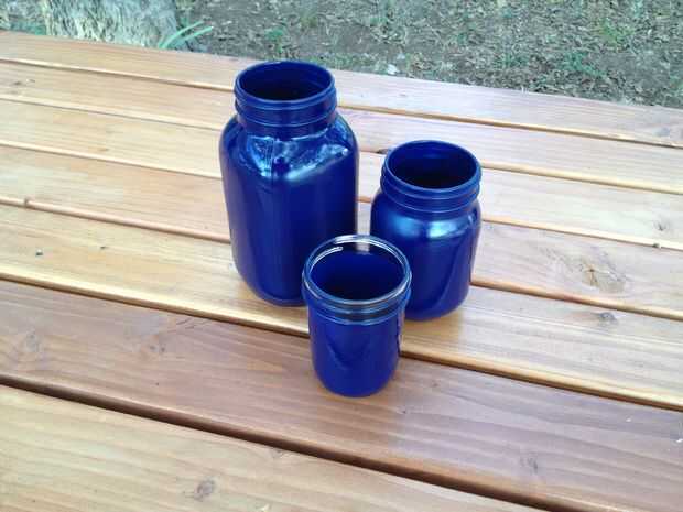 Spray fuera masón tarros y tapas con color base deseado y asegúrese de que tener una buena capa uniforme con cobertura total. Usted puede añadir cinta de pintores alrededor del borde y dentro de la tapa. Deje que la pintura seca antes de comenzar el siguiente paso.
