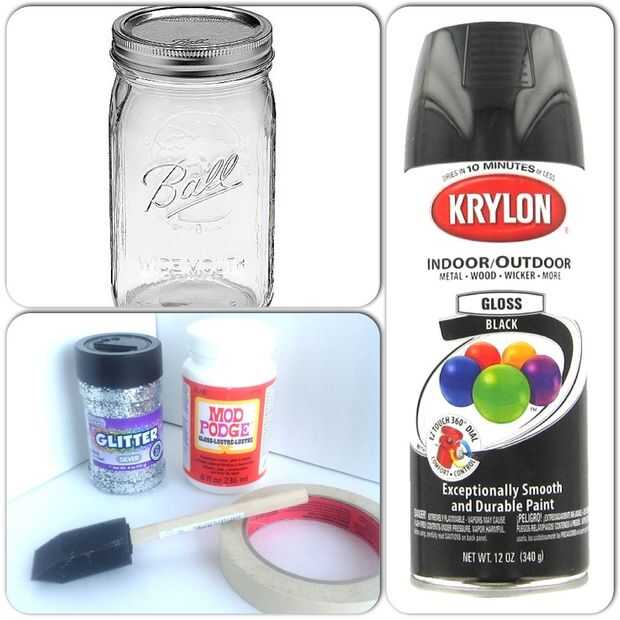 Todo lo que necesitas es: 1) Krylon alta brillante pintura de aerosol negra 2) brillante pegamento Mod Podge 3) pintura esponja 4) cinta adhesiva 5) tarro de masón