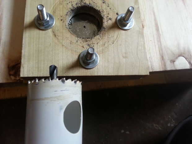 Apuntar la broca piloto a través del centro de la tapa y poner en pausa una vez que ha pasado a través de todo el camino.
