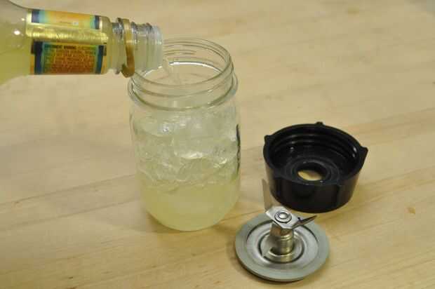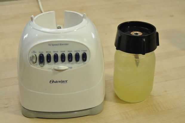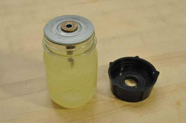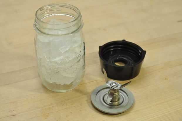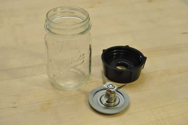 Atornille la base del tarro de masón de la jarra de la licuadora. (La mayoría pero no todos los mezcladores utilizan las roscas del mismo exactas como un tarro de masón. Mi licuadora pasa a ser una marca Oster).