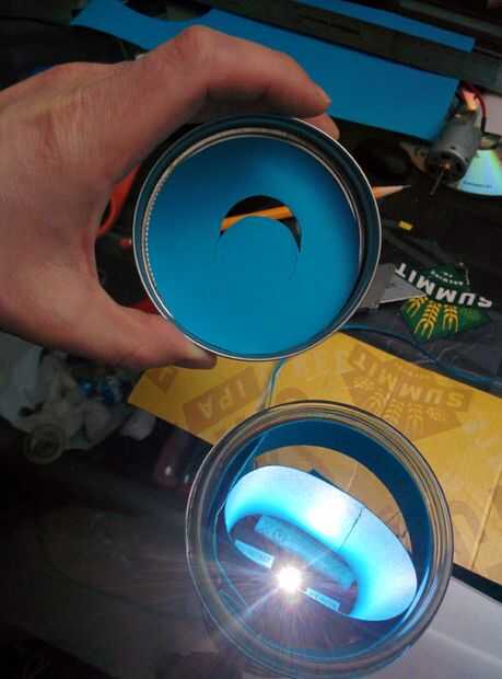 Ponga la tapa de la jarra con la tapa de corte nuevo, asegurando que se puede ver el LED de cada borde de cualquier imagen que desea proyectarse. Si el borde no ve el LED, el LED no proyectar sobre el techo.