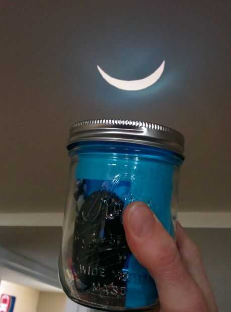 Su tamaño de imagen proyectada dependerá el tamaño de su abertura y la distancia entre el tarro de masón y el techo. Desde una larga distancia, tamaño de la luna de recorte aumenta grandemente, pero del aparador de los niños en el techo mi proyección de imágenes es la correcta. Esto se sugiere como un área de investigación, doctor.