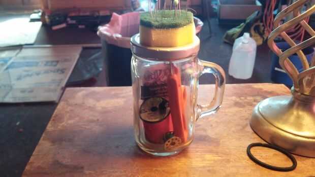 Llene ahora el frasco con todas sus necesidades de costura, empuje algunos alfileres y agujas en la esponja y hecho!