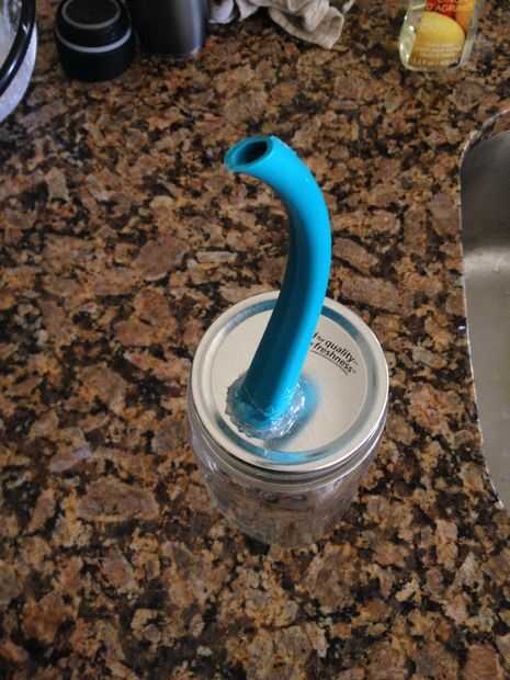 A continuación, cortar el tubo y haga un orificio en la tapa del tarro de masón (aproximadamente del mismo tamaño). Luego caliente pegar el pico a la parte superior de la tapa.
