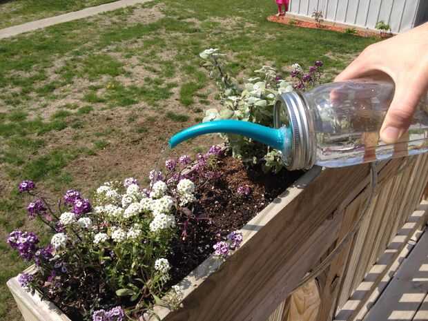 Tarro de Masón se llenan de agua y vaya a divertirse! Me encanta utilizar tarros de mason para todo, y prefiero tener sólo una tapa alrededor en lugar de un contenedor entero de riego.