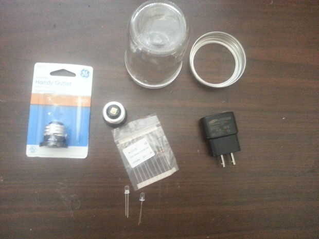 Se necesita un tarro de masón, cargador del usb 5 voltios que no perderse, leds de su elección, resistencia y una ' mano '. La salida útil es un simple conector que se atornilla a una toma de luz y la convierte en una toma de corriente. La resistencia que utiliza es de 220 ohmios y los leds que utiliza son leds RGB que ciclo de colores sin un IC. El cargador USB se utilizará para alimentar los leds.