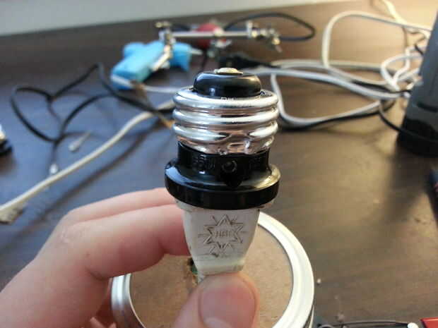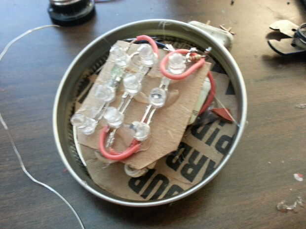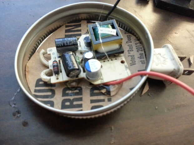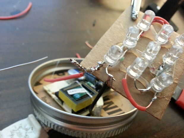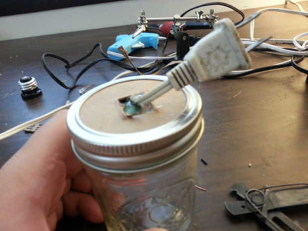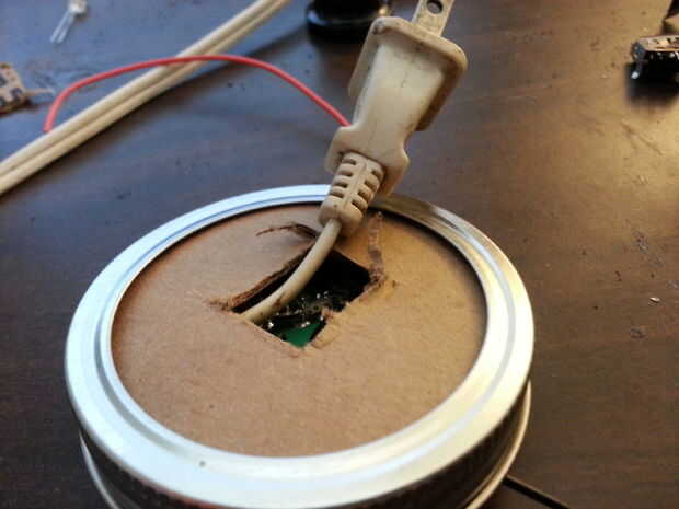 La mayoría masón tarros vienen con tapas de círculo de metal que separan de la virola. Esto reemplacé con un pedazo de cartón equipada. Cartón tiene algunas ventajas sobre la tapa del metal. No hará las conexiones no deseadas y es más fácil de cortar. Todo el trabajo para este paso se centra en la tapa. En primer lugar cortar un agujero en la tapa y alimentar el cable de CA a través de él entonces pegamento caliente la tarjeta de circuitos USB en su lugar. Asegúrese de pegar en el centro de la tapa. Después de que se puede soldar el cable positivo a la resistencia antes los leds entonces el cable negativo al cable negativo de los leds. Luego pegamento caliente los leds en el tablero de circuito USB. Aquí es donde el cartón bajo el LED desempeña un papel importante. Aísla los leds y evita que las conexiones no deseadas. Ahora puede conectar cable en el conector de salida útil.