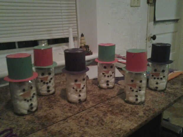 Originalmente usé estos frascos para una manualidad de Halloween. Era bolas de algodón con una variedad de diferentes arañas color que he utilizado LED velas para iluminar antes de Halloween. Noche de Halloween (que en realidad era la noche de truco o trato en mi ciudad) tomó hacia fuera los LEDs y puso en rojo y neón palillos del resplandor verde, todos los cuales salieron al día siguiente. La otra modificación fue sacar las arañas. Este fue un proyecto muy sencillo una vez que conseguí el truco de hacer los sombreros. En vez de poner afuera como yo lo hice con la versión de Halloween, estos sólo irá en el alféizar de mi ventana. No he puse luces en ellos todavía, pero todavía estoy considerando lo.