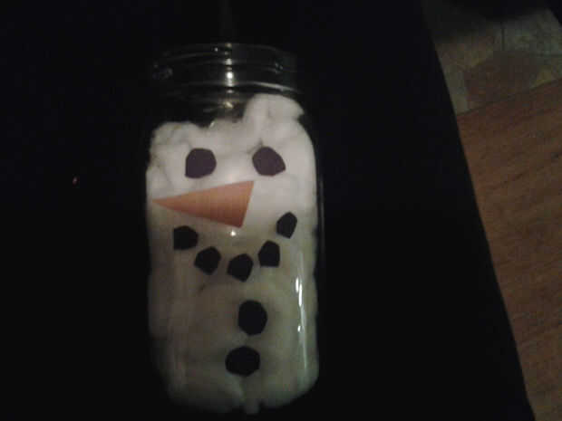 Allí se planteó poner letras en un lado de mi tarro. Pongo la cara en el lado opuesto de la jarra. La forma de los ojos, boca y botones no es importante. Lo único que me aseguré de fue a hacer las piezas de la boca inferior de los ojos o los botones. Los ojos y los botones terminaron siendo aproximadamente el mismo tamaño. Utilicé los restos de los sombreros negros para hacerlos. No hacerlas individualmente. puse dos trozos pequeños juntos, uno encima del otro y cortar hacia abajo. Eran algo de la misma forma, pero no ponerlos forma simétrica porque ningún muñeco de nieve combinan características. Hice lo mismo con la boca y los botones. Por supuesto puede cortarlas hasta sus preferencias. Utiliza naranja, por supuesto, cortar triángulos para la nariz. Puse los tarros en mi regazo para evitar balanceo y trazado de las caras. Los graba, en lugar de pegar porque quiero poder cambiarlos a decoraciones de Halloween el año próximo. Salí de lo de la nariz suelta y grabado sólo el lado corto del triángulo a la jarra para darle un aspecto 3D más realista. Una vez más, es de ti y de tus preferencias. Una vez que las piezas de la cara están aseguradas a la jarra, si usted mantiene el cuerpo de sombrero y la parte superior, póngaselos. Se acaba su muñeco de nieve. :) Puede utilizar estos para decorar como tengo la intención de hacer o dar como regalo de Navidad. Me encanta hacer regalos hechos en casa para mi familia y amigos.
