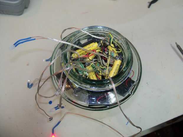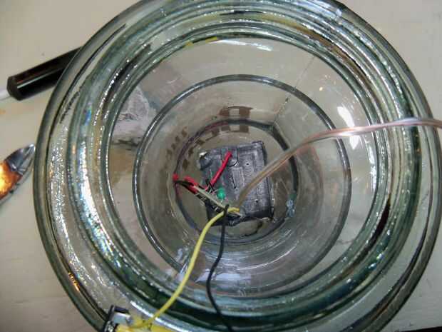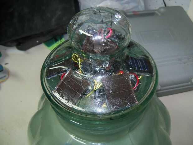 El siguiente paso es colocar todos los paneles solares, placas de circuito y las baterías en la tapa.  Esto es bastante sencillo, sólo asegúrese de que el vidrio esté limpio y ninguno de los paneles se superponen.  Virar en lugar con pegamento caliente.  Los LEDs de sus cables deben colgar hacia fuera de la parte inferior.