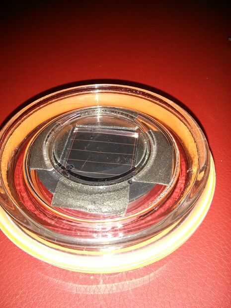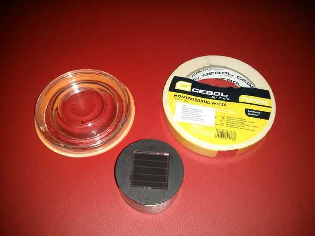 Para ser capaz de conectar la luz en la tapa, estoy usando una cinta de scotch doble cara, cortar en cuatro trozos de igual tamaño. Estos se unen a la luz como se muestra en las fotos. Tenga cuidado de no bloquear el panel solar al aplicar la cinta ya que esto impedirá la adecuada recarga de la batería durante el día.