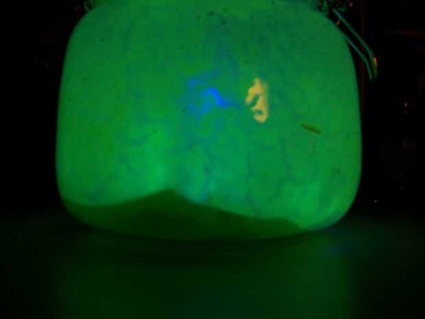 Entonces ¿qué es una luz brillante que se ve oscura? Bien, la luz UV tiene una propiedad interesante, causa un número de productos químicos para fluorescencia. Fluorescencia es cuando una sustancia absorbe la luz de un espectro y emite luz de un espectro menor. En este caso, el fotón de alta energía UV golpea algún resplandor en la pintura oscura, haciendo que emiten un resplandor verde espeluznante (en torno a 540nm, en una suposición). Por lo tanto, tarro del sol espeluznante!