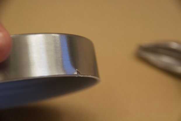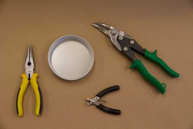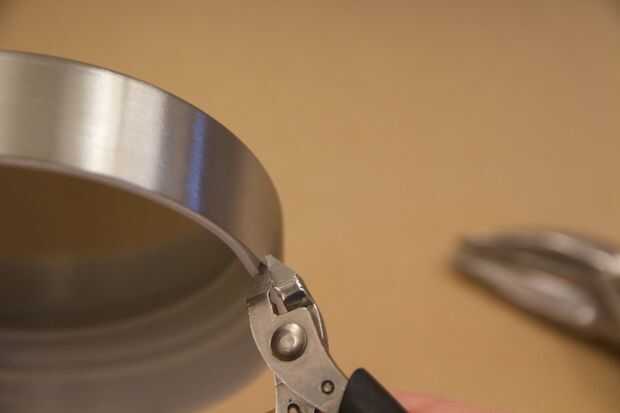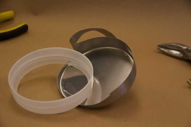 Para quitar la tapa de metal, deslizarse algunos cortadores de alambre o tijeras entre las piezas de plástico y de metal para hacer un pequeño corte de la lata. Retire este corte con alicates. Tenga cuidado, el metal es muy fino y fuerte! Mantener los hilos de rosca de plástico, con cuidado tire del metal (tal vez envuelto en cinta para que no rasgue la bolsa de basura)