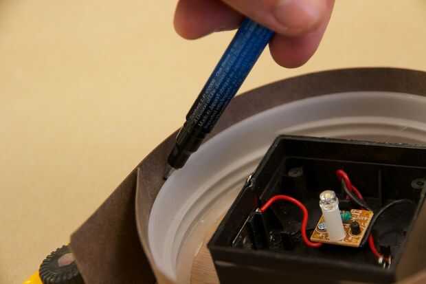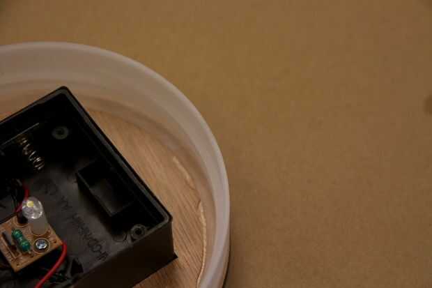 Coloque la luz en el soporte usando pegamento caliente. Si puedes, utiliza el pegamento caliente para hacer un sello. Esto protegerá la electrónica Si la jarra está expuesta al agua de lluvia.