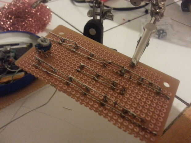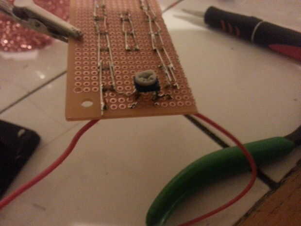 Vamos a usar dos piernas de las tres patas de la olla. Hay 2 piernas juntas y una pierna por sí mismo. Solo puede cortar una de las dos patas que están juntos. Ya que usé un tablero PCB/perf quería un montaje seguro de la olla. Puesto que los leds se enfrentarán el bote tuvo que montarse en el reverso. Necesitará sodler un plomo de la olla a los cables de positivo de los leds. Ya que los leds están en paralelo donde de la soldadura no importa. Siempre y cuando su en el positivo de los leds. El otro cable de la olla tendrá que soldarse a la salida de voltaje de la batería.