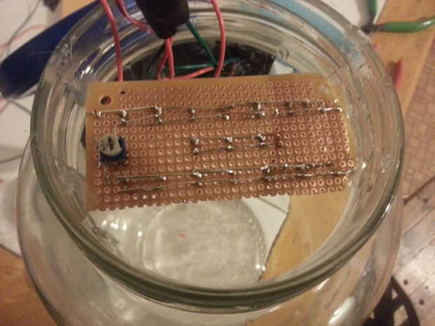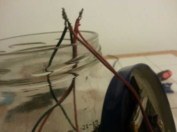 La construcción está llegando a su fin. Montar los leds en la boca del frasco con pegamento caliente. Asegúrese de que estén lo suficientemente bajos como para poder cerrar la tapa. Después de que los leds están asegurados puede hacer todas las conexiones finales. La soldadura de los cables de led a la salida del controlador, soldar los cables del panel solar con el controlador de carga y aislar! Asegúrese de que la polaridad de las conexiones son correctas. Aislar los alambres pelados con cinta aislante.