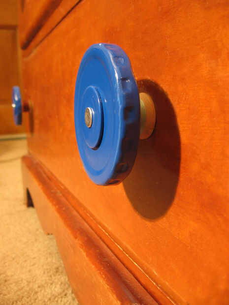 En lluvia de ideas sobre otras maneras de volver a propósito estas tapas de frasco, diseñadores de Michael y Cheryl Caston de diseños CAMIC creado tarro tapa tira. Tarro tapa tira son tiradores que reutilización las tapas de tarro de alimento gastado como utilizan carretes de madera de hilo. Postes de aluminio extra largo, que se utilizan para crear libros de recuerdos, mantienen todas las piezas en su lugar. El gran tamaño de las tapas del tarro hace fácil para los niños el uso y una gran manera de añadir un toque extra de color a la decoración de su hogar. Usted encontrará que estos tiradores añadir carácter a los muebles viejos y convertirse en la pieza de conversación de cualquier habitación. Personalizar tus propios conjuntos eligiendo el tamaño y el color de la tapa del tarro y carrete.