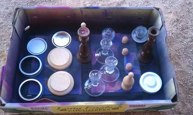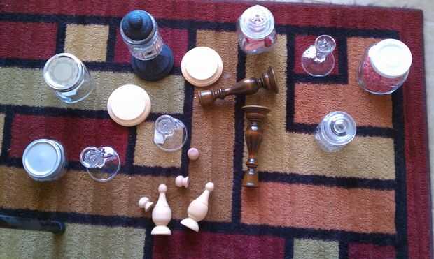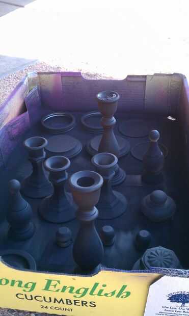 Paso 2 - preparado todo con excepción de los recipientes claros - luego rociados con una combinación de pintura negro mate y negra piedra en aerosol