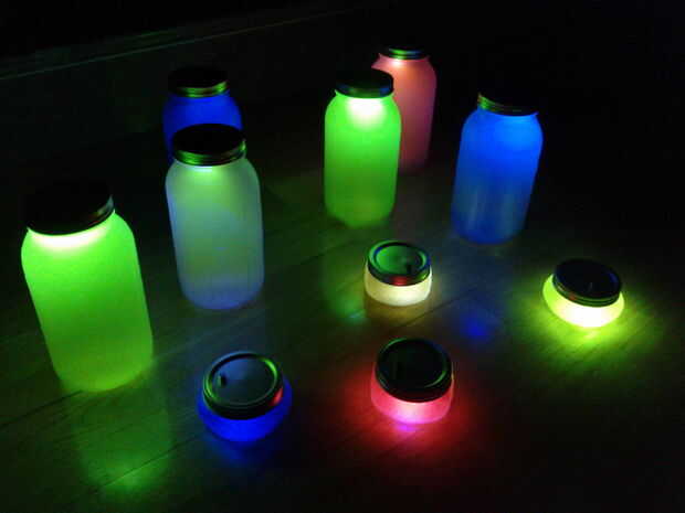 Con esa lista de piezas largas, lo que termina con es un tarro buscando inocente llenada de un líquido coloreado. Ningún circuito o batería es visible puesto que el líquido que llena todo el camino a la cima, junto con la capa de vidrio esmerilado, aparece como opaco y ocultar completamente el montaje de iluminación. Puesto que el frasco se sella, el interruptor on/off es nuestro pequeño imán de tierras extrañas, que colocar en la tapa metálica para los espíritus que brilla intensamente. Los colores fluorescentes difiere el color natural del agua teñido, así un degradado bonito se forma cuando los tarros del resplandor.