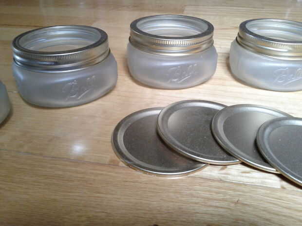 Cubrir completamente los párpados y el exterior de los fondos de la jarra con la pintura en aerosol oro. Ligeramente spray parches de oro esparcidas alrededor así como otras superficies de vidrio. El efecto oro-parches-de--vidrio esmerilado hace los contenedores parecen grandes en luz del día.