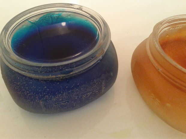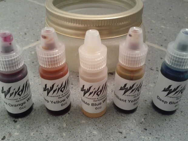 Llene un tarro de masón con agua casi todo el camino hasta la parte superior como se muestra. Elegir un color de tinte y coloque 10 gotas sin importar el tamaño de su tarro de masón. Cuando se ilumina con luz ultravioleta, el color de la fluorescencia no es del mismo color de lo que se ve en luz del día. Por ejemplo, la jarra que aparece blanca en la foto se fluorescencia en azul! Así que lea la etiqueta para escoger su color.