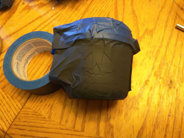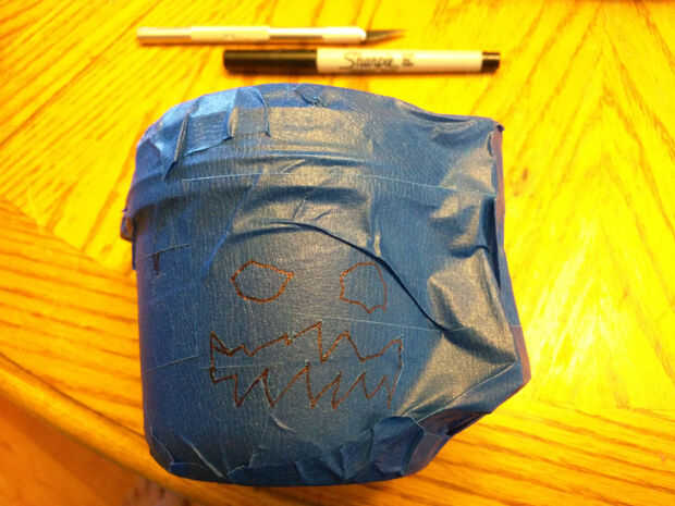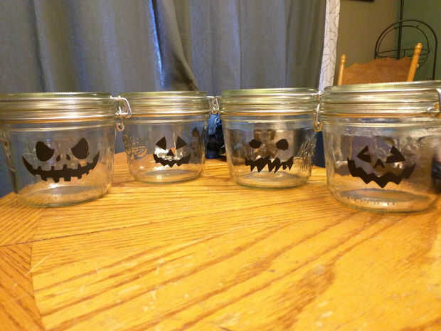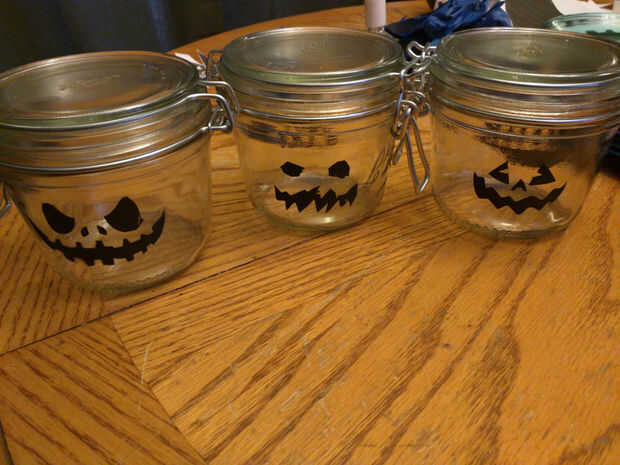 Utilizando un rotulador que dibujé en algunos rostros escalofriantes, cuidadosamente cortadas las caras utilizando una navaja, spray los frascos con pintura en aerosol negro mate 2 capas hicieron el truco para mí. Después de que la pintura esté seca, con cuidado retire la cinta adhesiva.