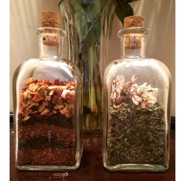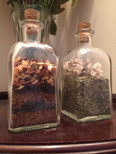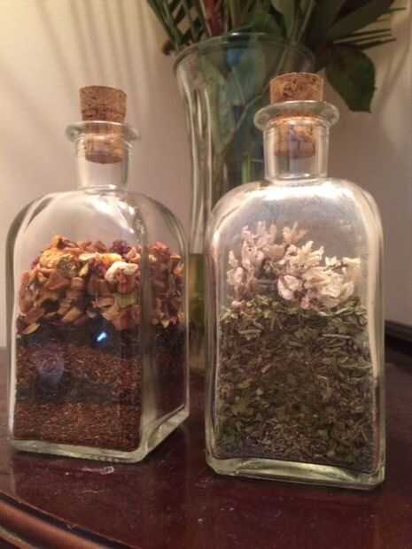 Así que me metía el gusanillo de hacer algo astuto cuando noté que tenía dos tarros vacíos adorables y un camión (exagero, de hecho) de hojas secas de diente de León, perejil, tomillo, hojas de té negro Nepal, té de rooibos y té de naranja sanguina pela. ¿Qué es un tipo artístico con todos esos materiales maravillosos? Iniciar un proyecto con ellos, por supuesto! Y después de una hora o así de hacer cuidadosamente la escritura, estos chicos malos.