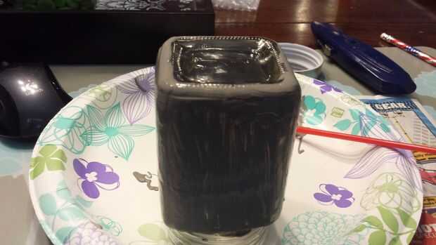 Pintar tanto el jar como usted quiera. Asegúrese de que usted pinta sobre la plantilla para que la abertura se cubre bien. No Pinto la parte inferior, también no pintar los hilos. He añadido tres capas por lo que estaba bien cubierto.