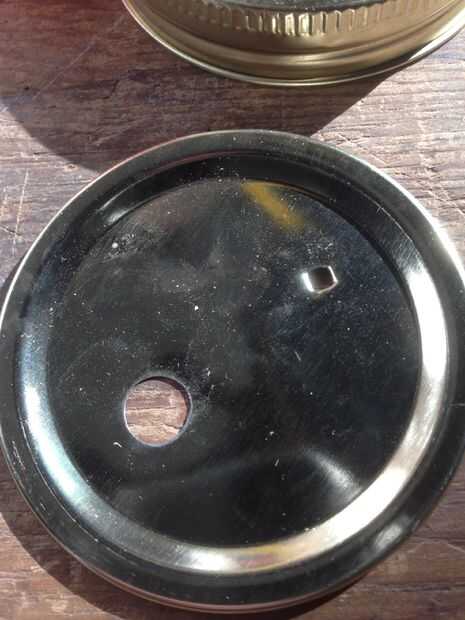 Use un clavo de 1/8" de diámetro para añadir un taladro de paraguas frente al orificio más paja. Asegúrese de también aplane la parte posterior de la tapa con un martillo para eliminar cualquier borde filoso.