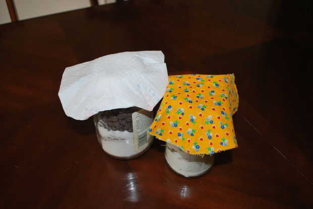 Tome la banda elástica y envuelva alrededor de la tela alrededor del borde de la tapa de la jarra.