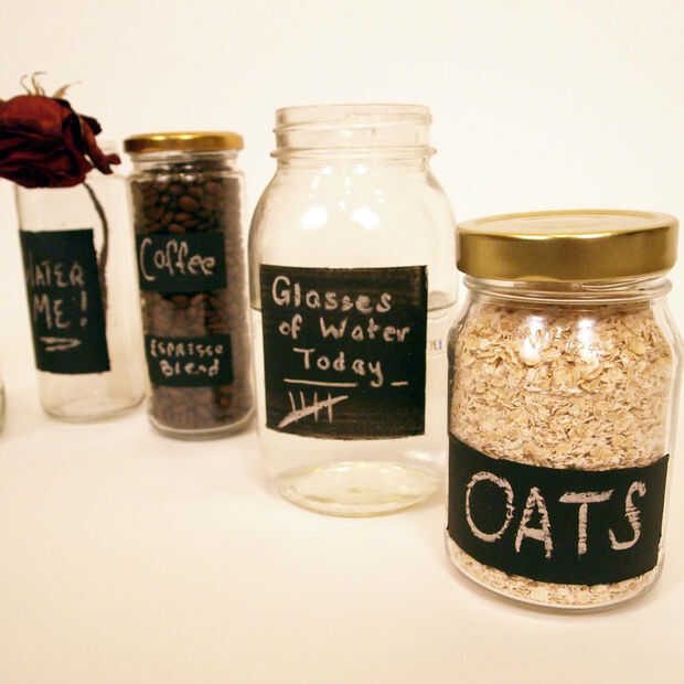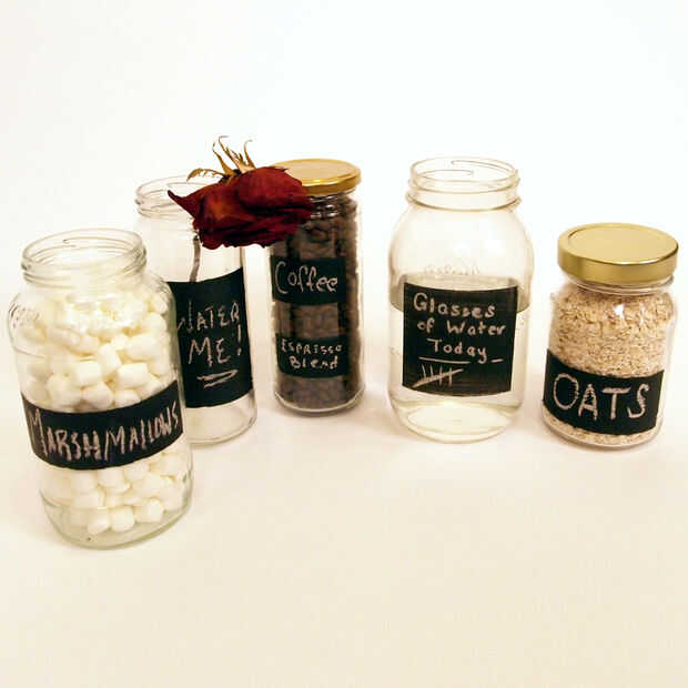 Todo lo que necesitas hacer tus propios frascos de pintura de pizarra es tiza, cinta de pintor y la pintura pizarra. No sólo sus tarros será de rápidamente etiquetar, fácilmente serás capaz de distinguir entre sus granos de café, malvaviscos, sesos de mono seco y todo lo que se ha almacenado en sus frascos. Vas a tener los frascos más lindos para su laboratorio de este lado de la novia de Frankenstein.