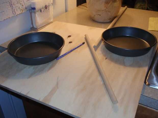 Un tablero de madera para colocar el pastel encima de. Medida tamaño necesitada basado en los moldes te uso y luego dar usted unas pulgadas extras.