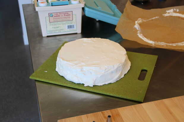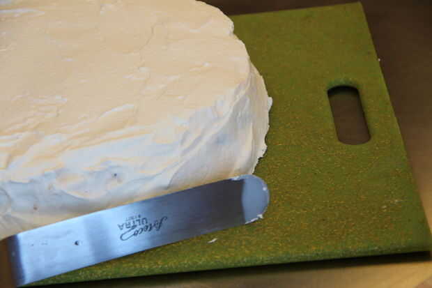 Retire el pastel del congelador y colocar sobre la superficie de la porción. Utilice esa misma espátula helar para limpiar los bordes.