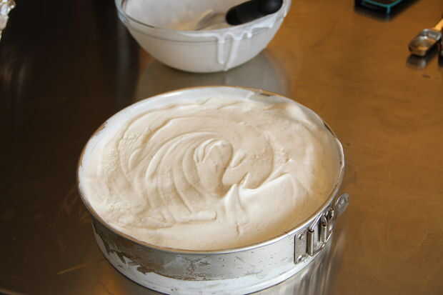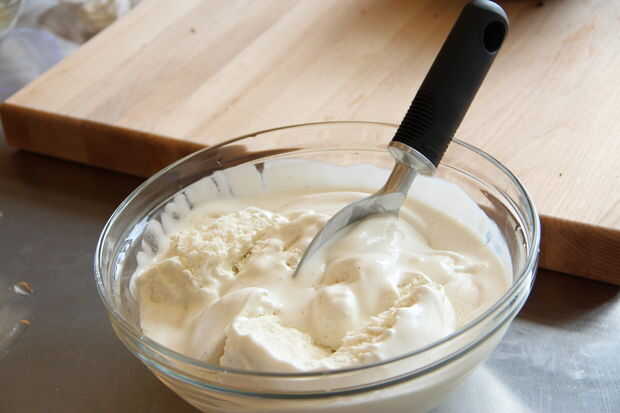 Utilizando las mismas técnicas como antes, ablandar el helado de vainilla y suavemente extendió encima de la capa crocante. Tenga cuidado de no revolver demasiado y alterar el centro y traer para arriba. Suave a la parte superior del helado por lo que es plano.