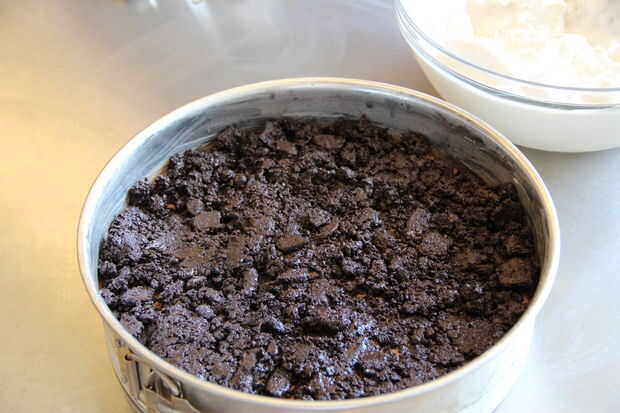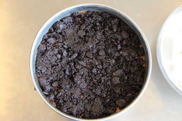 Difundir los crujientes de chocolate en una capa uniforme sobre el conjunto ahora helado de chocolate base.